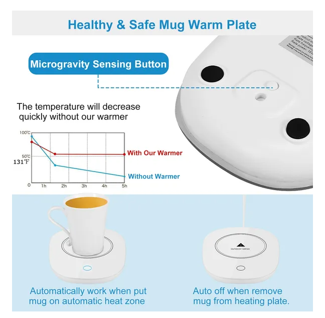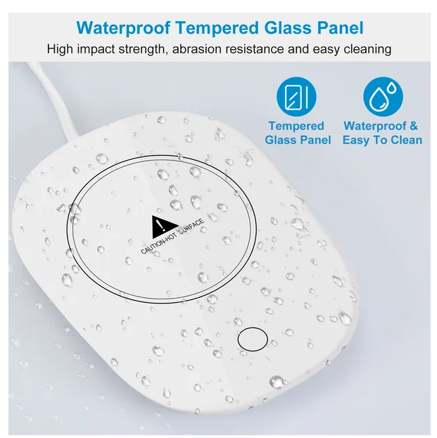 **SAFE & LOW POWER CONSUMPTION*:Come with 4 non-skid feet at the bottom to help support your mug and prevent spills. 16W low power consumption and excellent heat focusing,adopts waterproof tempered glass which allows it to evenly warm beverages while remaining safe and stable.